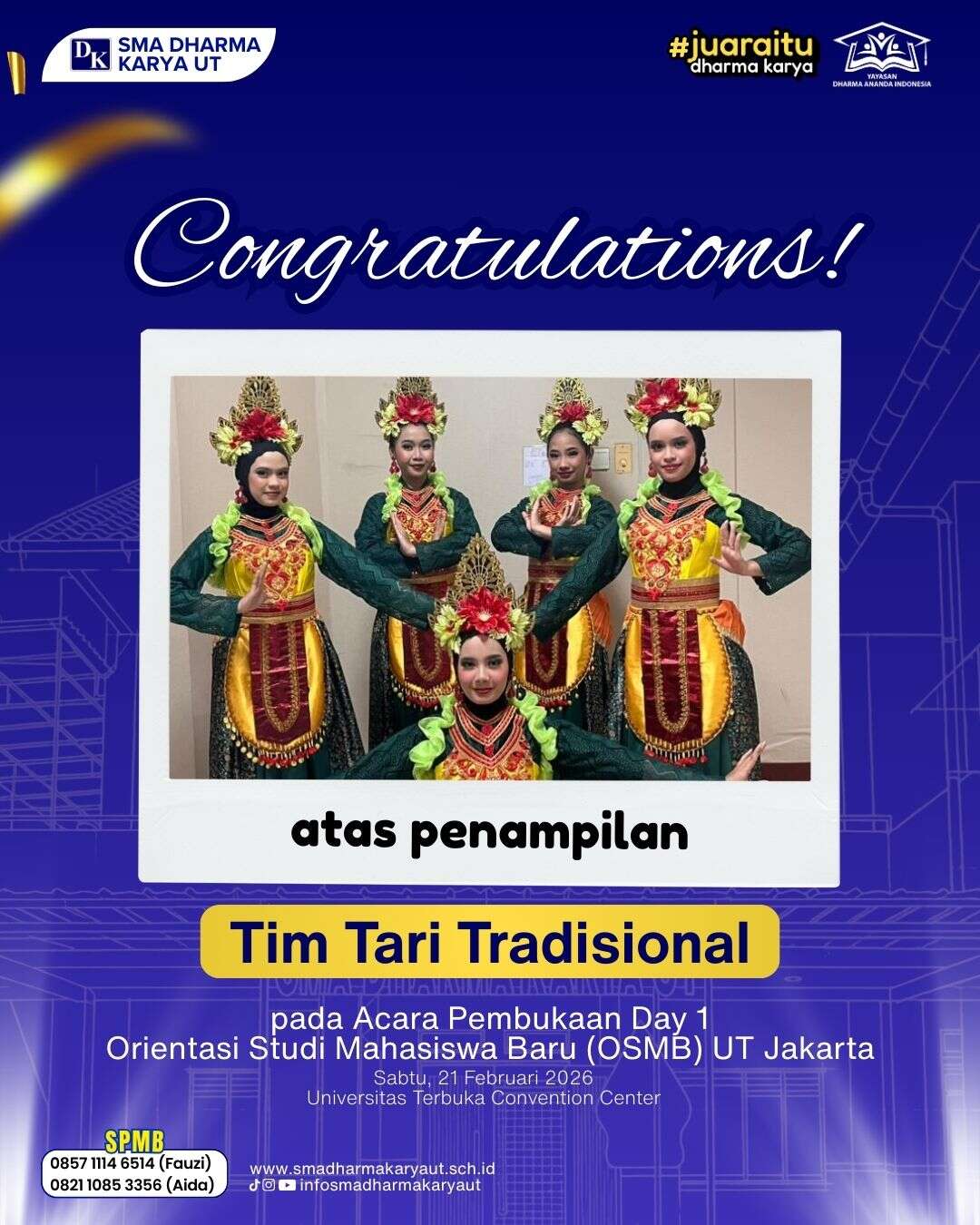 Selamat dan Sukses Atas penampilan Tari Tradisional SMA Dharma Karya UTPada hari Sabtu 21 Februari 2026, tim tari dari siswa SMA Dharma Kar...
