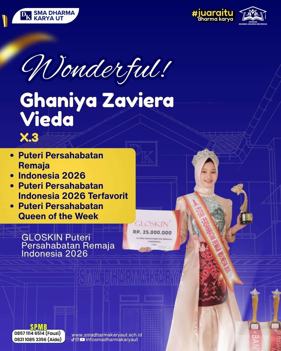 Selamat dan Sukses Atas terpilihnya sebagai Puteri Persahabtan Remaja Indonesia Siswa SMA Dharma Karya UTAtas nama siswa Ghaniya Zaviera Vieda dari k...