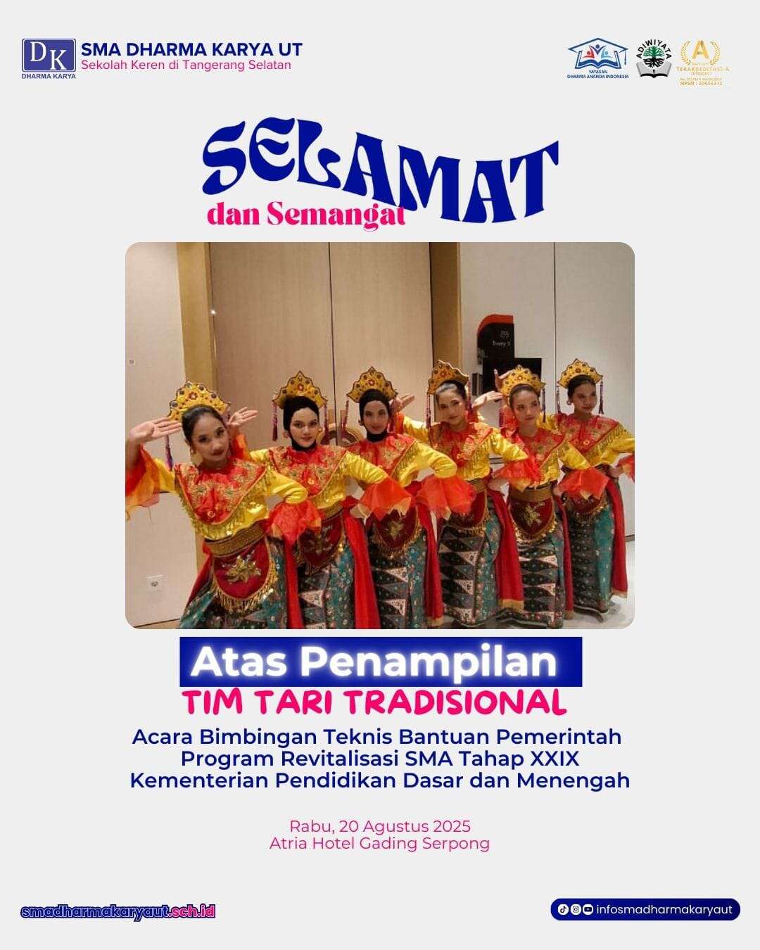 Selamat dan Sukses Atas penampilan Tari Tradisional SMA Dharma Karya UTPada hari Rabu, 20 Agustus 2025, tim tari dari siswa SMA Dharma Karya UT...
