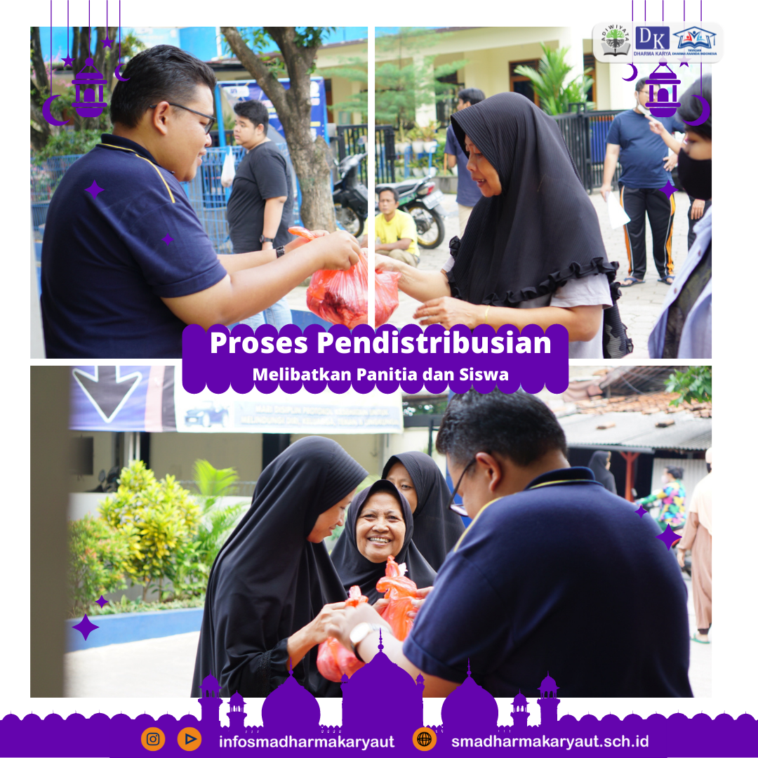 Pendistribusian hewan qurban pun tidak mendatangkan penerima hewan qurban untuk datang ke sekolah, melainkan para panitia dan siswa yang terjun langsung untuk membagikan daging hewan qurban kepada setiap warga sekitar sekolah.