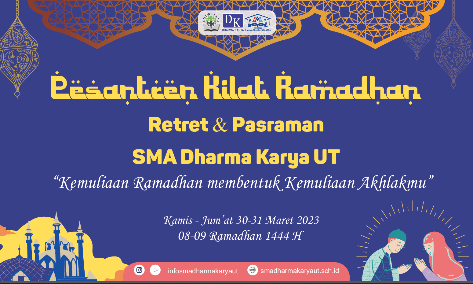 Pada hari Kamis tanggal 30-31 Maret 2023 telah dilaksanakan acara Pesantren Kilat Ramadhan, Retret dan Pasraman, Program ini merupakan agenda tahunan sekolah, yang dilaksanakan pada bulan Ramadhan, acara ini diikuti oleh seluruh siswa-siswi SMA Dharma Karya UT dari Kelas 10 - 12, dalam kegiatan ini yang Muslim melaksanakan kegiatan Pesantren Kilat Ramadhan, yang Kristen melaksanakan acara retret dan yang beragama Hindu melaksanakan kegiatan Pasraman dalam waktu yang bersamaan.