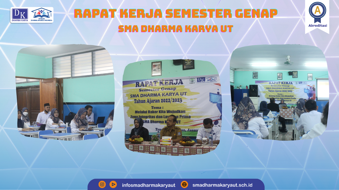 Pada hari selasa Tanggal 03 Januari 2023, SMA Dharma Karya UT telah melaksanakan kegiatan Raker semester Genap tahun pelajaran 2022-2023. Kegiatan yang dilaksanakan secara Offline ini dilaksanakan di Aula lantai 3 SMA Dharma Karya UT.