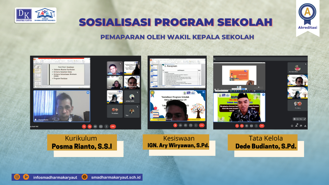 Acara sosialisasi ini dilaksanakan secara daring, melalui Press Conference Google Meeting, acara yang dilaksanakan secara tatap maya ini berjalan dengan lancar, yang dipandu oleh MC kondang Guru SMA Dharma Karya UT, Mohammad Haqul Mubin, S.Pd.