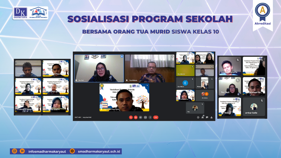 Pada Hari ini Sabtu, tanggal 20 Agustus 2022, pada jam 08.00 - 10.00 WIB telah dilaksanakan acara Sosialisasi Program Sekolah yang dihadiri oleh seluruh Guru, Karyawan dan para Orang Tua Murid siswa-siswi kelas 10 SMA Dharma Karya UT.